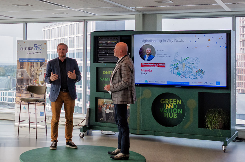 Klaes blikte vervolgens met Koen Haer, programma manager van Agenda Stad, die net als FCF haar 10-jarig jubileum viert dit jaar. Ze keken terug op de afgelopen jaren en de samenwerking daarin met FCF om vervolgens vooruit te kijken naar de ontwikkelingen binnen AgendaStad en de regiodeals die daar straks ook plek gaan vinden. Een bijzonder moment was het tekenen van de nieuwe samenwerkingsovereenkomst met Agenda Stad. Deze samenwerkingovereenkomst gaat over de kansen van digitalisering binnen een tweetal citydeals.